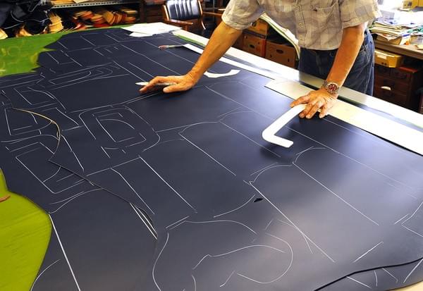Để làm ra một chiếc Randoseru, trước tiên những người thợ sẽ vẽ và cắt những miếng da theo kích cỡ quy chuẩn có sẵn.