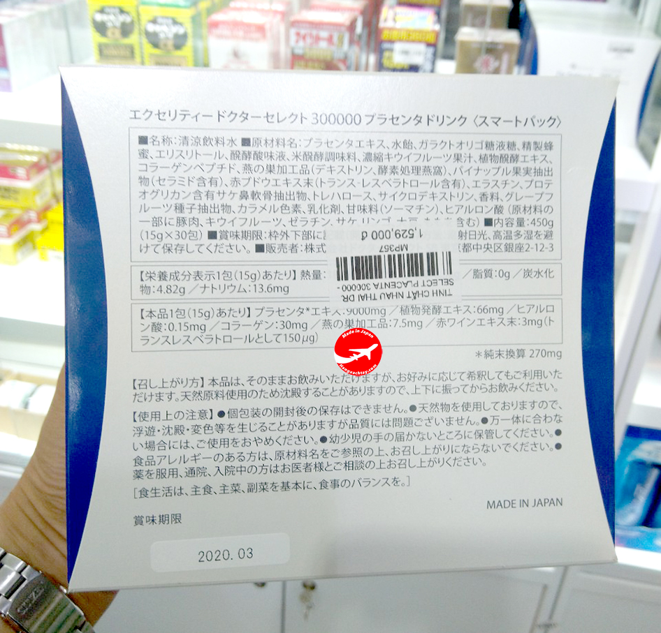 - Tinh chất nhau thai heo: 9,000mg cùng với Collagen, Tổ yến, chiết xuất 71 loại thực vật lên men, Proteoglycan, Hyaluronic acid, chiết xuất rượu vang, Eslatin…